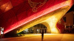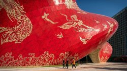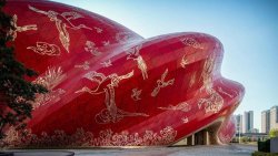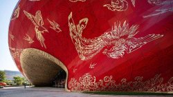 Здание обшито красными треугольными композитными панелями, которые имитируют складки на ткани. Оболочка покрыта узорами, основанными на традиционном искусстве татуировки. Тематика узоров "1000 птиц, отдающих дань уважения Фениксу", также является традиционной для росписи шелка.